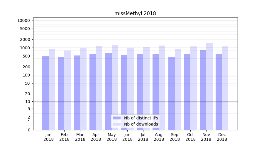 Number of downloads for software package missMethyl, year by year, from 2025 back to 2014 (years with no downloads are omitted):
