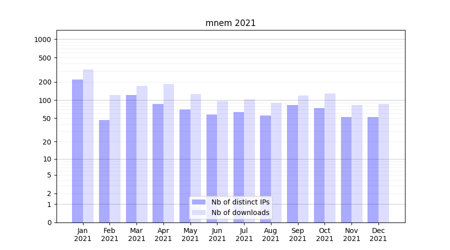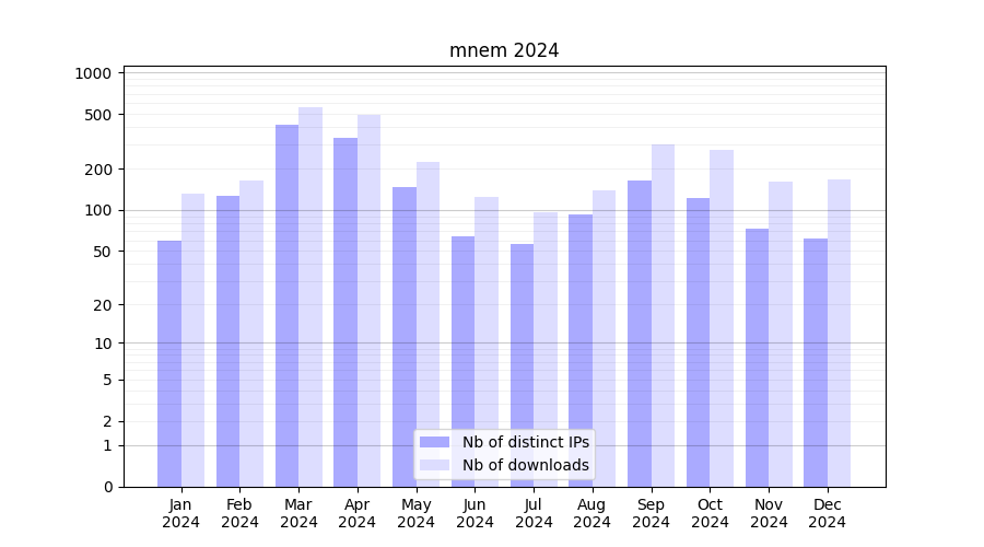 Number of downloads for software package mnem, year by year, from 2025 back to 2014 (years with no downloads are omitted):