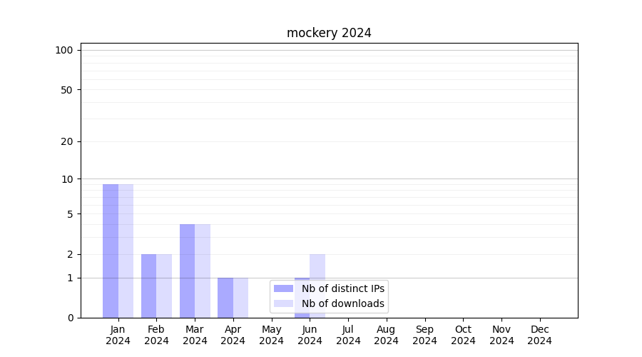 Number of downloads for software package mockery, year by year, from 2025 back to 2014 (years with no downloads are omitted):