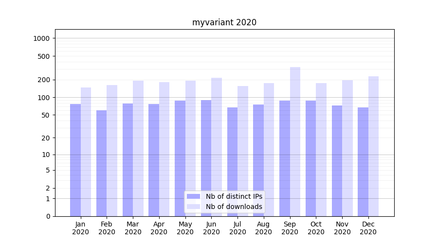 Number of downloads for software package myvariant, year by year, from 2025 back to 2014 (years with no downloads are omitted):