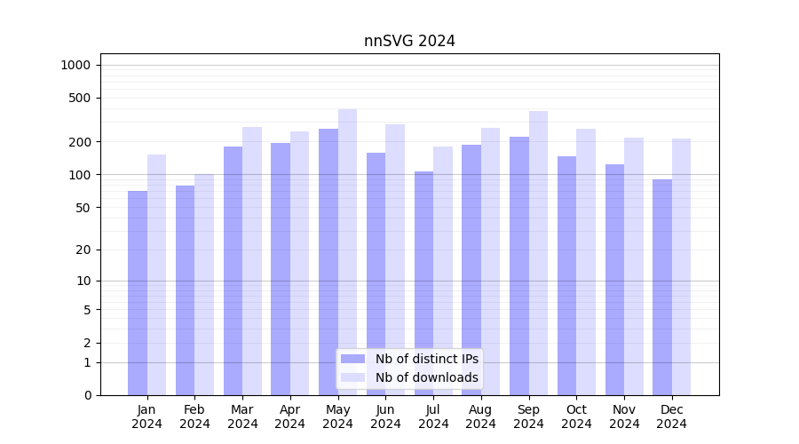 Number of downloads for software package nnSVG, year by year, from 2025 back to 2014 (years with no downloads are omitted):