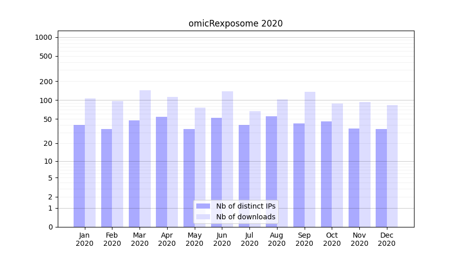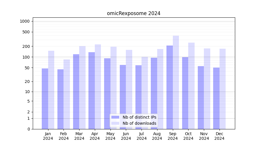 Number of downloads for software package omicRexposome, year by year, from 2025 back to 2014 (years with no downloads are omitted):