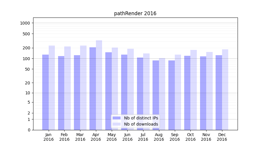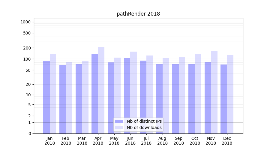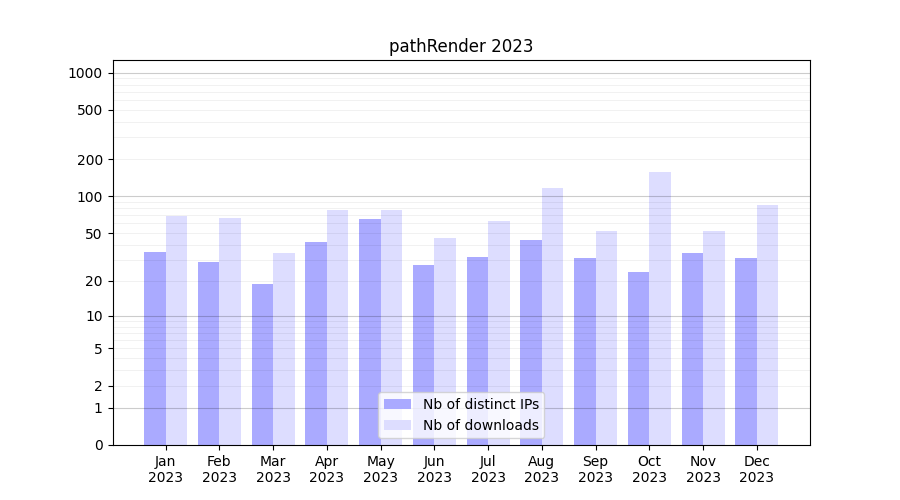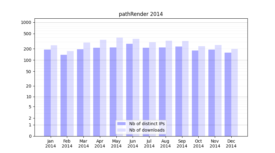Number of downloads for software package pathRender, year by year, from 2025 back to 2014 (years with no downloads are omitted):