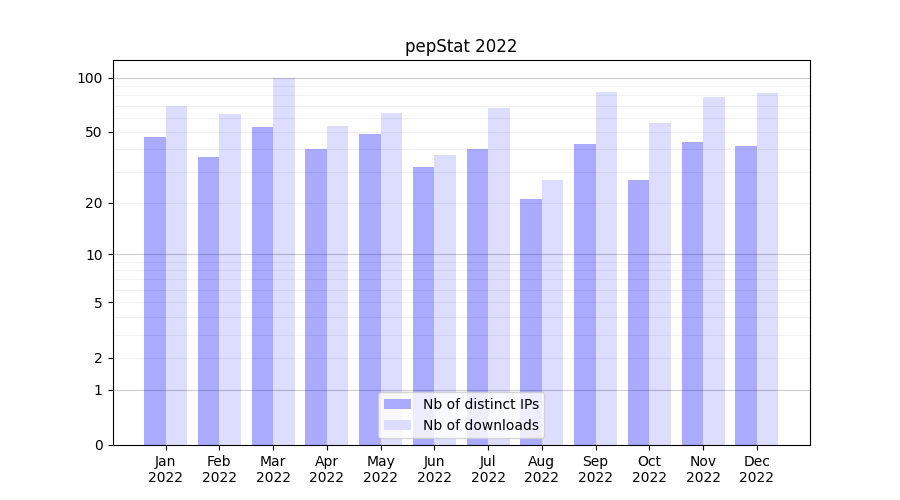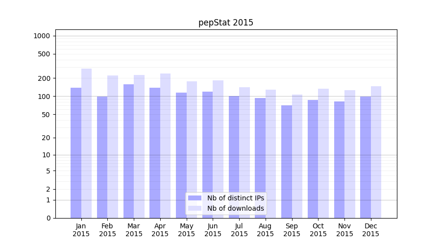 Number of downloads for software package pepStat, year by year, from 2025 back to 2014 (years with no downloads are omitted):