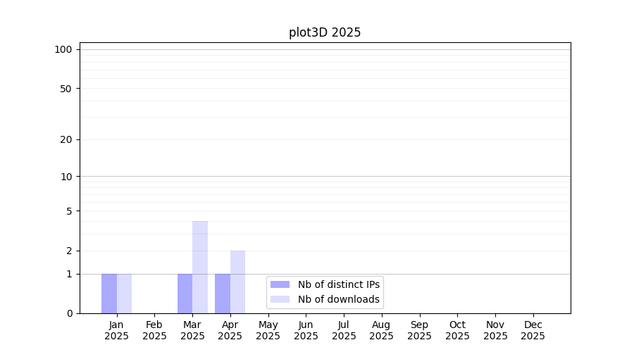 Number of downloads for software package plot3D, year by year, from 2025 back to 2014 (years with no downloads are omitted):