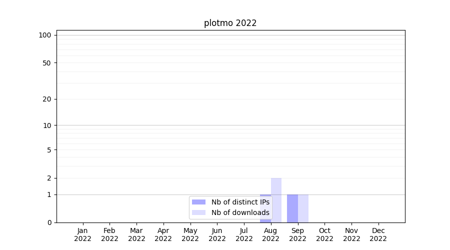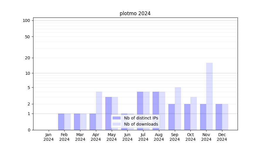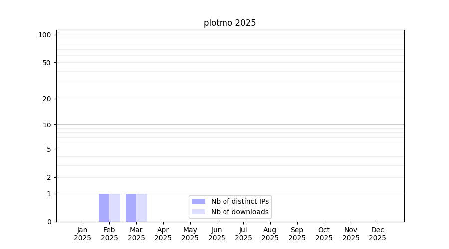 Number of downloads for software package plotmo, year by year, from 2025 back to 2014 (years with no downloads are omitted):