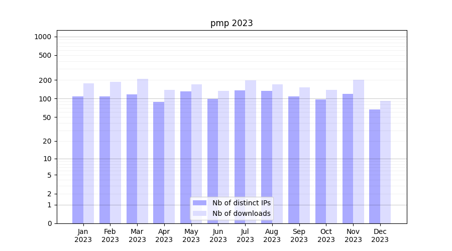 Number of downloads for software package pmp, year by year, from 2025 back to 2014 (years with no downloads are omitted):