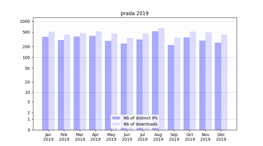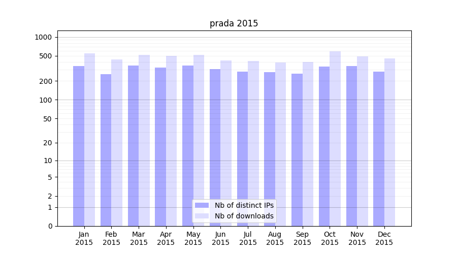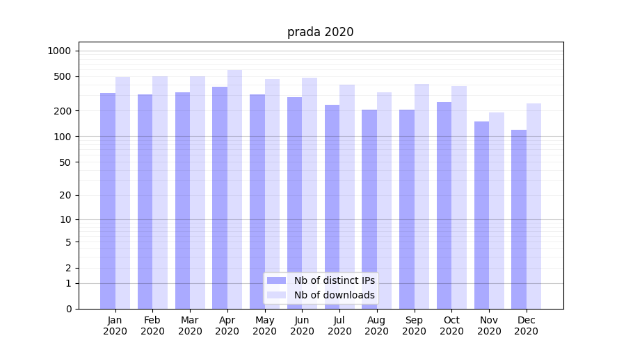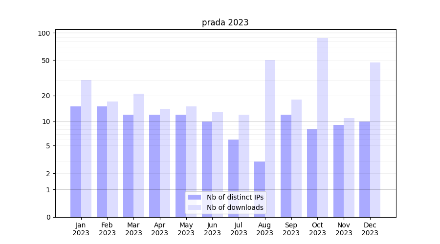Number of downloads for software package prada, year by year, from 2025 back to 2014 (years with no downloads are omitted):