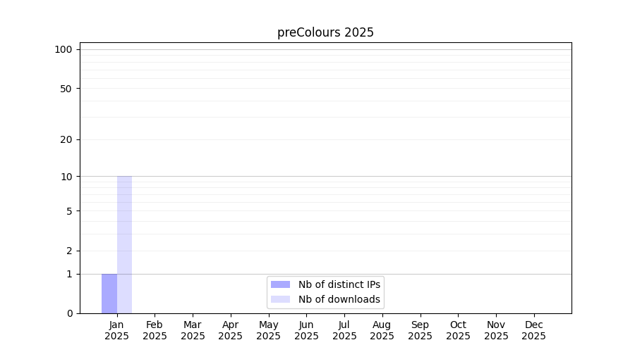 Number of downloads for software package preColours, year by year, from 2025 back to 2014 (years with no downloads are omitted):