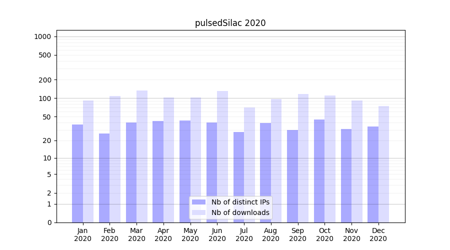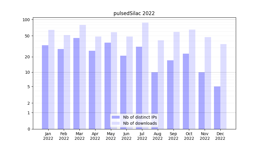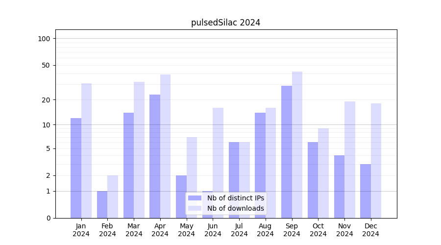 Number of downloads for software package pulsedSilac, year by year, from 2025 back to 2014 (years with no downloads are omitted):