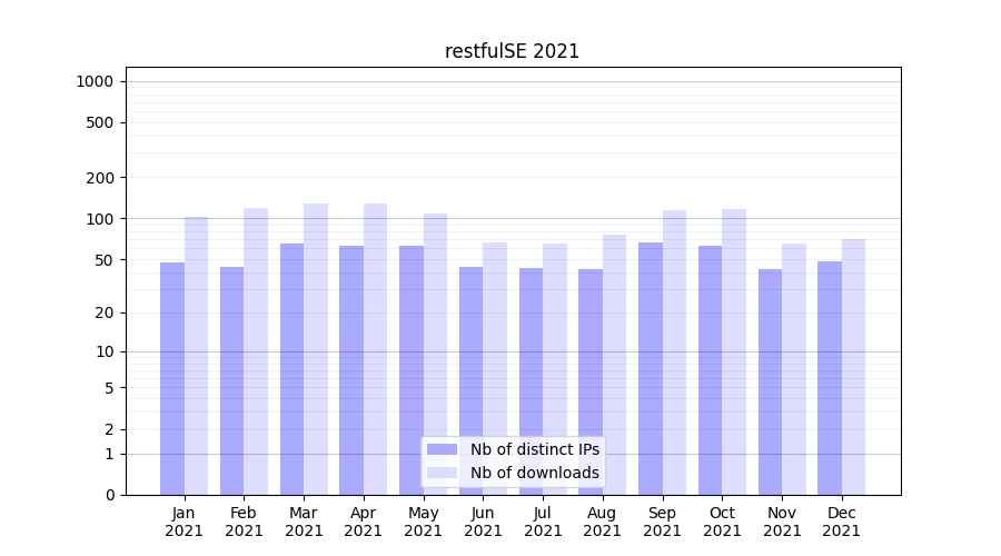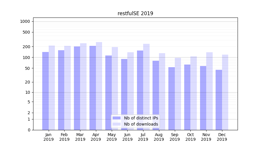 Number of downloads for software package restfulSE, year by year, from 2025 back to 2014 (years with no downloads are omitted):