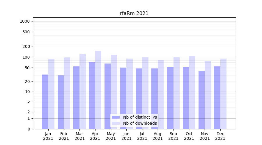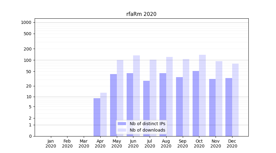 Number of downloads for software package rfaRm, year by year, from 2025 back to 2014 (years with no downloads are omitted):