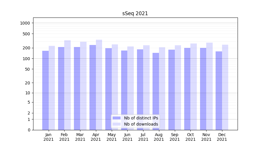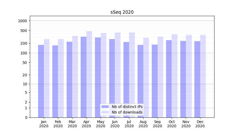 Number of downloads for software package sSeq, year by year, from 2025 back to 2014 (years with no downloads are omitted):
