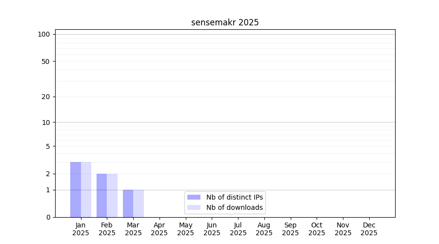 Number of downloads for software package sensemakr, year by year, from 2025 back to 2014 (years with no downloads are omitted):