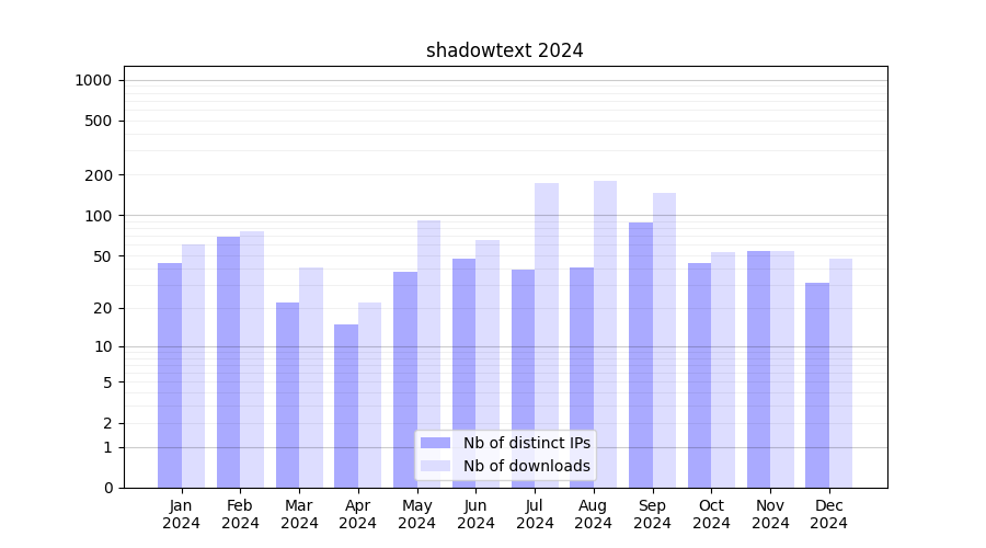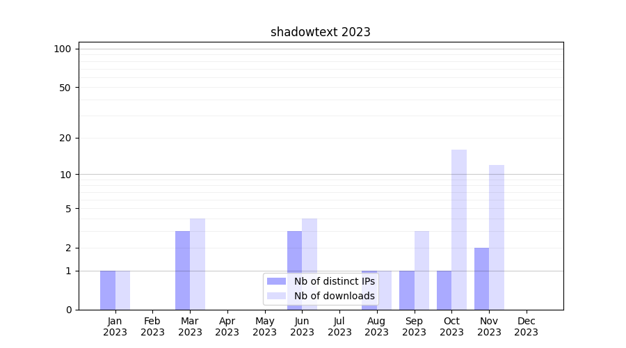 Number of downloads for software package shadowtext, year by year, from 2025 back to 2014 (years with no downloads are omitted):