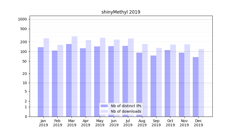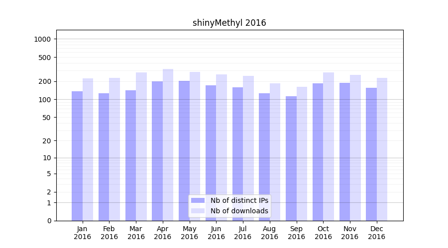 Number of downloads for software package shinyMethyl, year by year, from 2025 back to 2014 (years with no downloads are omitted):