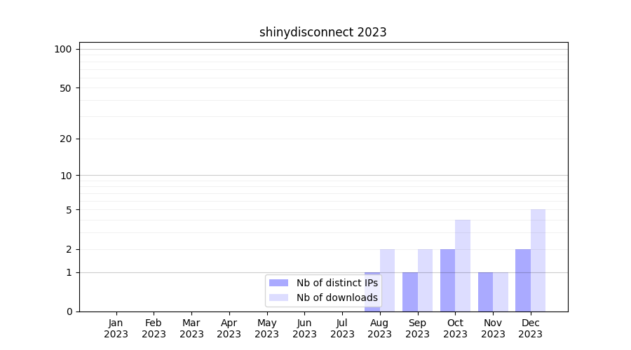 Number of downloads for software package shinydisconnect, year by year, from 2025 back to 2014 (years with no downloads are omitted):