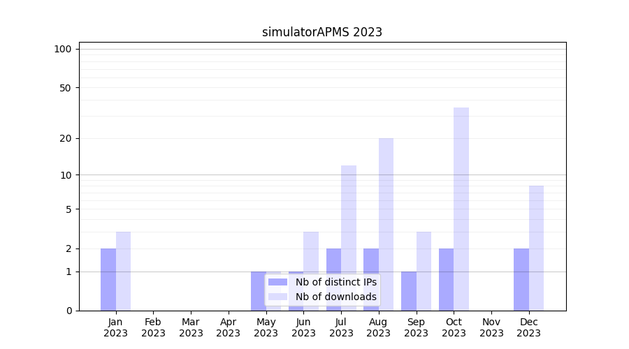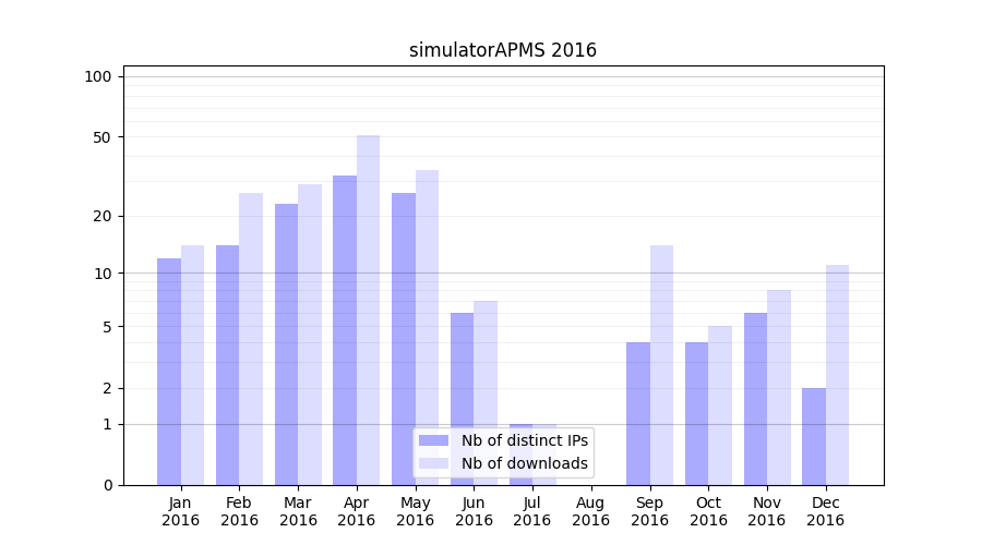 Number of downloads for software package simulatorAPMS, year by year, from 2025 back to 2014 (years with no downloads are omitted):