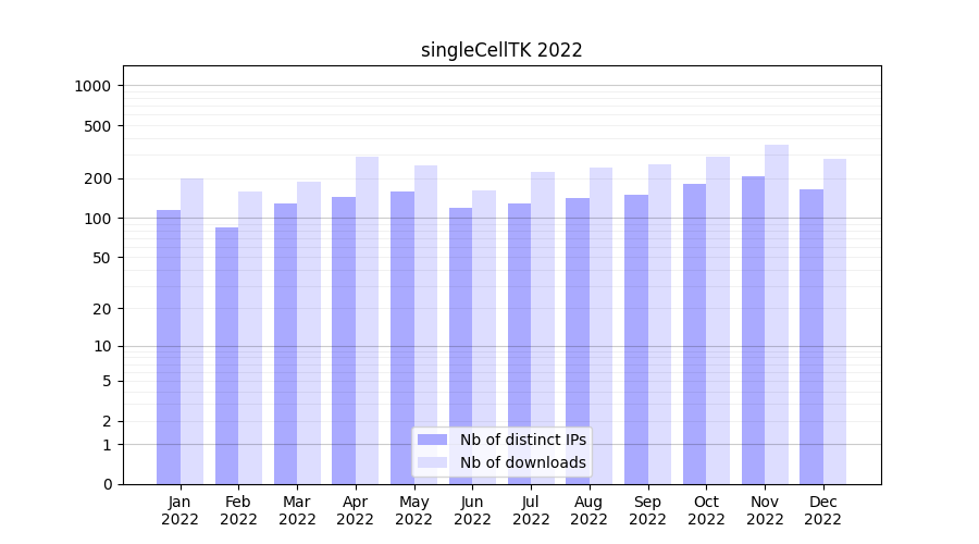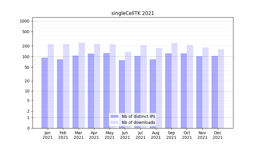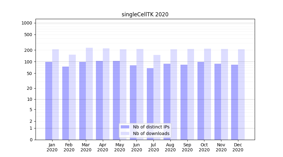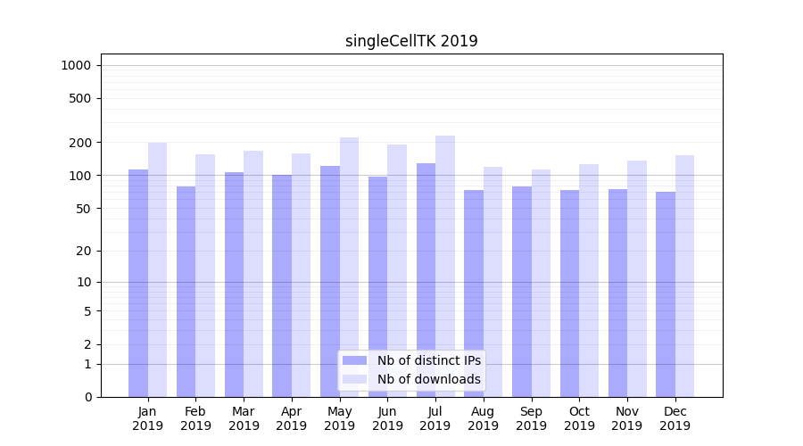 Number of downloads for software package singleCellTK, year by year, from 2025 back to 2014 (years with no downloads are omitted):