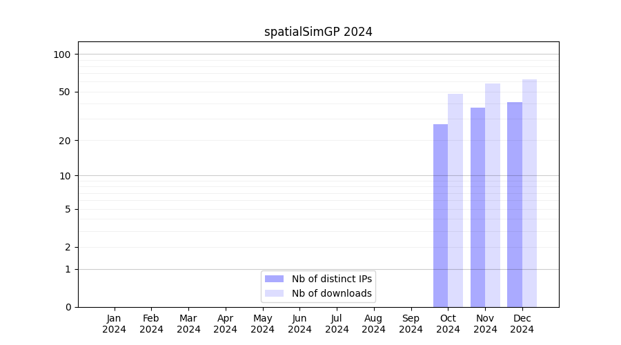Number of downloads for software package spatialSimGP, year by year, from 2025 back to 2014 (years with no downloads are omitted):