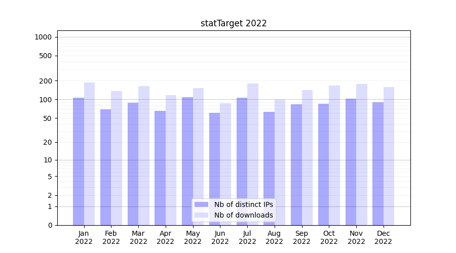Number of downloads for software package statTarget, year by year, from 2025 back to 2014 (years with no downloads are omitted):