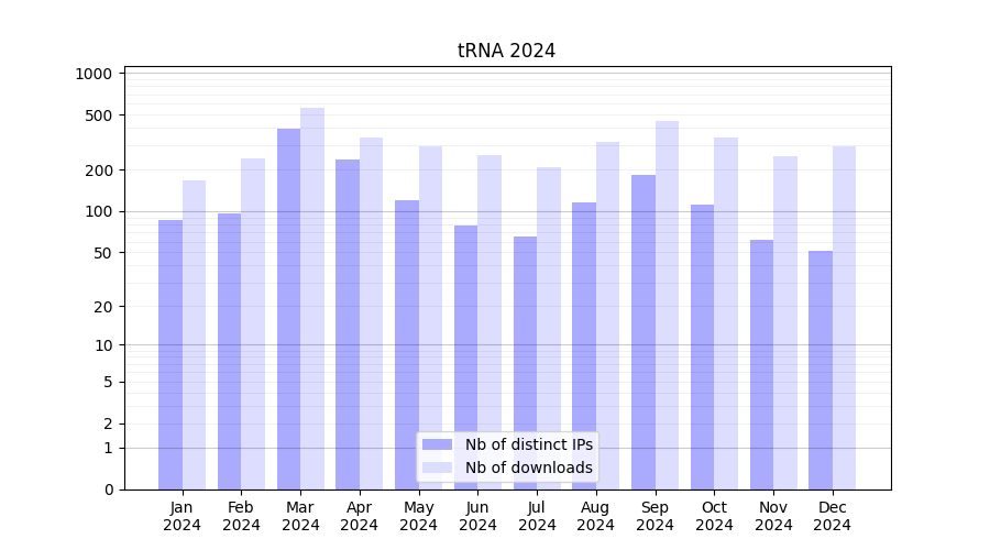 Number of downloads for software package tRNA, year by year, from 2025 back to 2014 (years with no downloads are omitted):