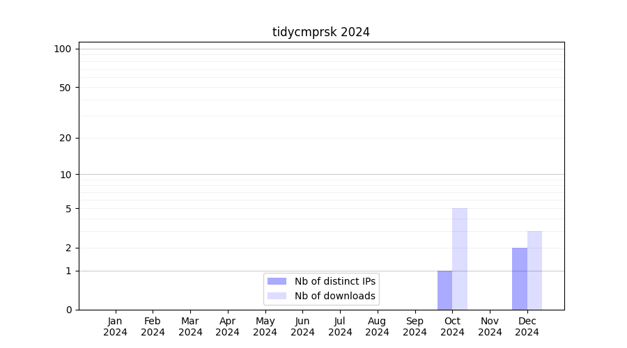 Number of downloads for software package tidycmprsk, year by year, from 2025 back to 2014 (years with no downloads are omitted):
