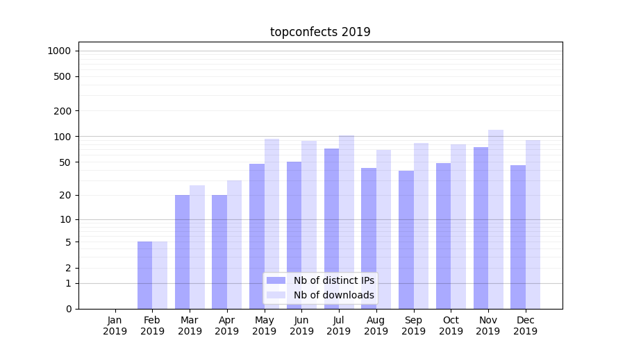 Number of downloads for software package topconfects, year by year, from 2025 back to 2014 (years with no downloads are omitted):