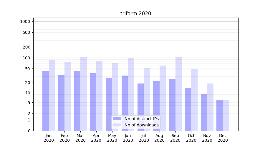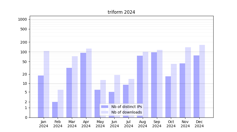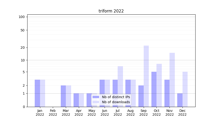 Number of downloads for software package triform, year by year, from 2025 back to 2014 (years with no downloads are omitted):