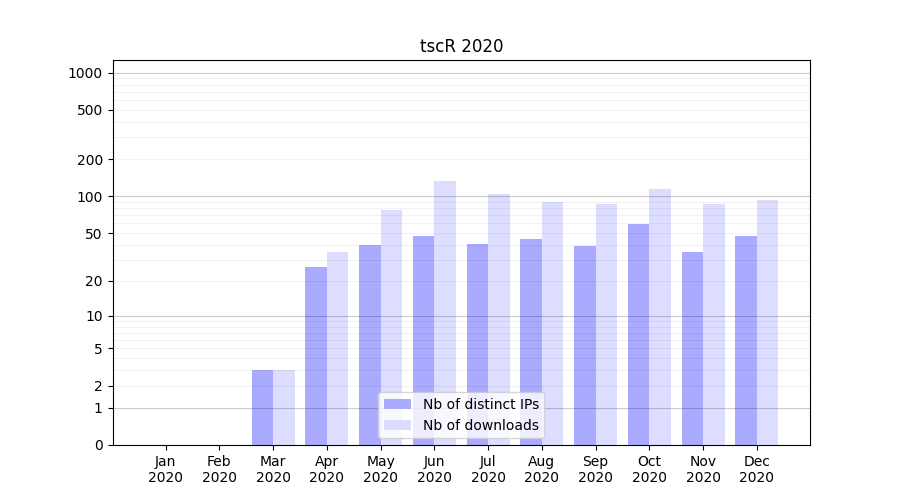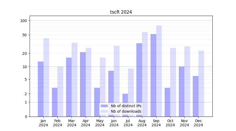 Number of downloads for software package tscR, year by year, from 2025 back to 2014 (years with no downloads are omitted):