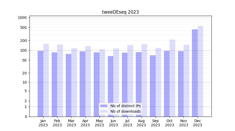 Number of downloads for software package tweeDEseq, year by year, from 2025 back to 2014 (years with no downloads are omitted):