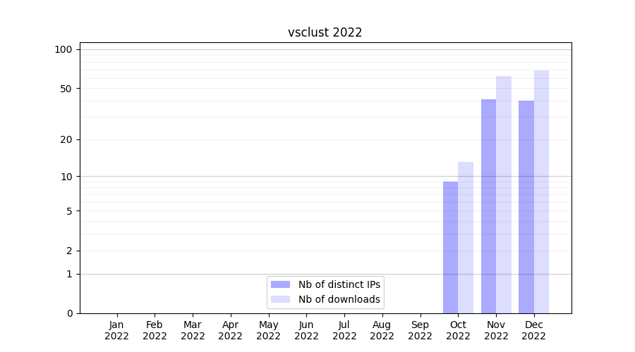 Number of downloads for software package vsclust, year by year, from 2025 back to 2014 (years with no downloads are omitted):