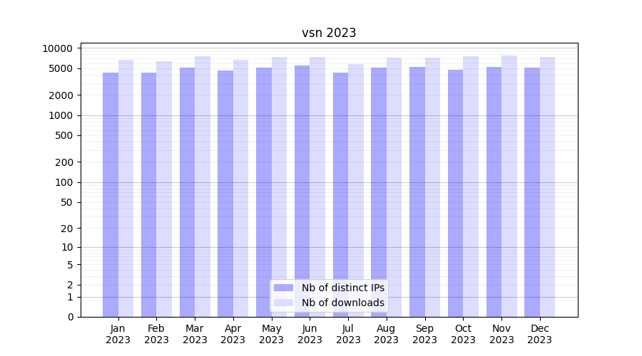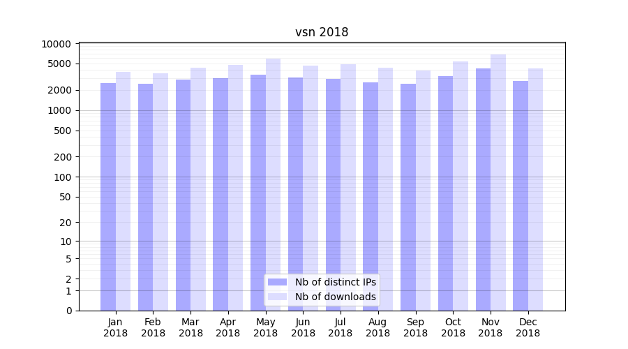 Number of downloads for software package vsn, year by year, from 2025 back to 2014 (years with no downloads are omitted):