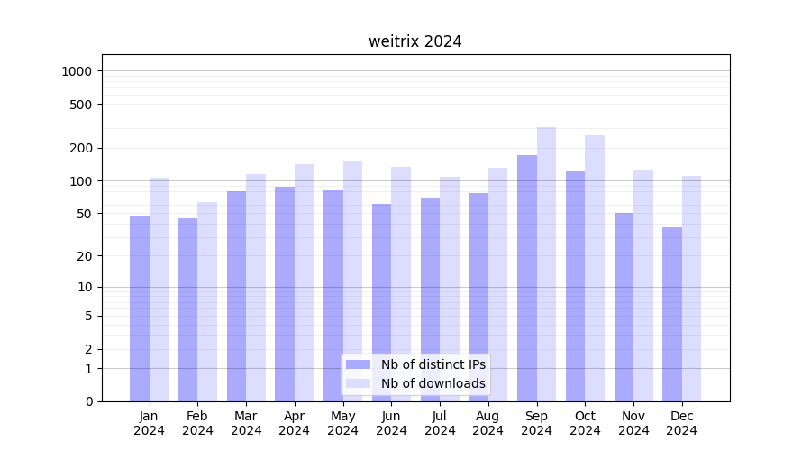 Number of downloads for software package weitrix, year by year, from 2025 back to 2014 (years with no downloads are omitted):