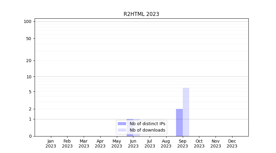 Number of downloads for annotation package R2HTML, year by year, from 2025 back to 2014 (years with no downloads are omitted):