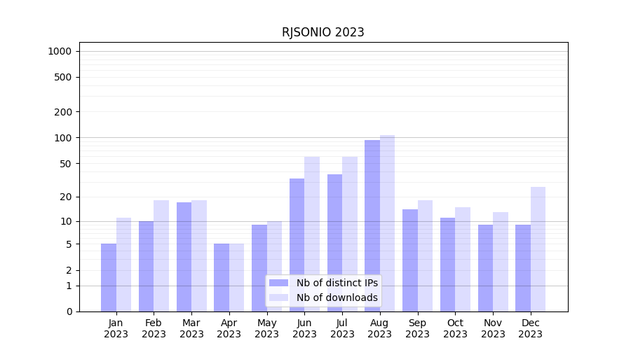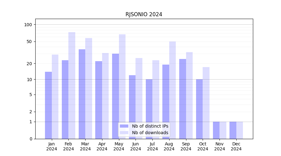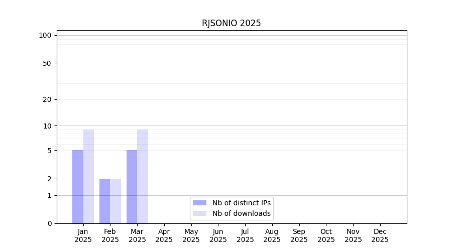 Number of downloads for annotation package RJSONIO, year by year, from 2025 back to 2014 (years with no downloads are omitted):