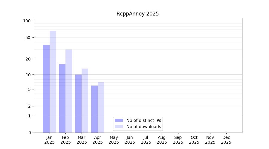 Number of downloads for annotation package RcppAnnoy, year by year, from 2025 back to 2014 (years with no downloads are omitted):