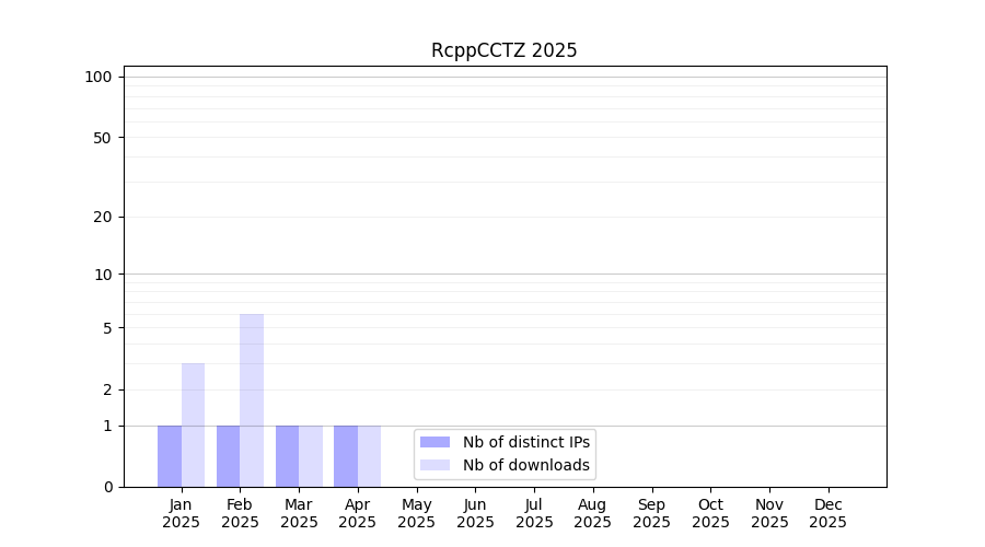 Number of downloads for annotation package RcppCCTZ, year by year, from 2025 back to 2014 (years with no downloads are omitted):