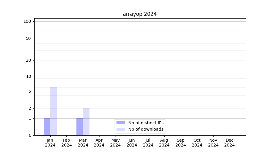 Number of downloads for annotation package arrayop, year by year, from 2025 back to 2014 (years with no downloads are omitted):