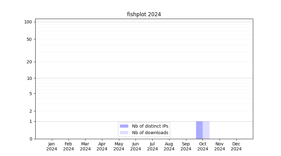 Number of downloads for annotation package fishplot, year by year, from 2025 back to 2014 (years with no downloads are omitted):