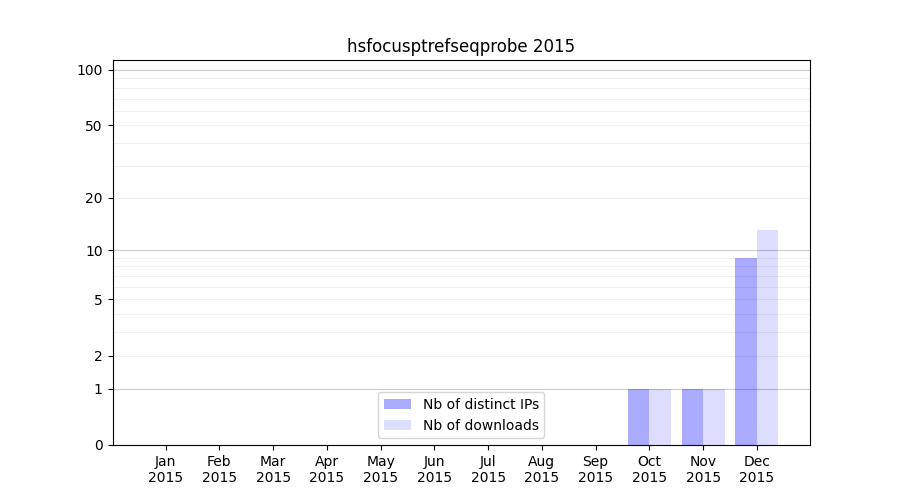 Number of downloads for annotation package hsfocusptrefseqprobe, year by year, from 2025 back to 2014 (years with no downloads are omitted):