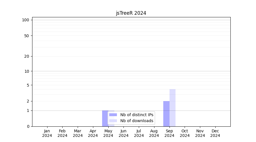 Number of downloads for annotation package jsTreeR, year by year, from 2025 back to 2014 (years with no downloads are omitted):