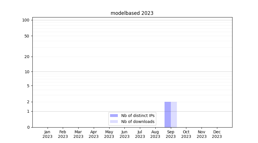 Number of downloads for annotation package modelbased, year by year, from 2025 back to 2014 (years with no downloads are omitted):