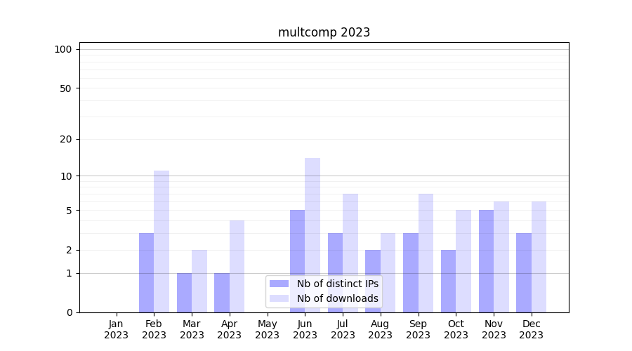 Number of downloads for annotation package multcomp, year by year, from 2025 back to 2014 (years with no downloads are omitted):