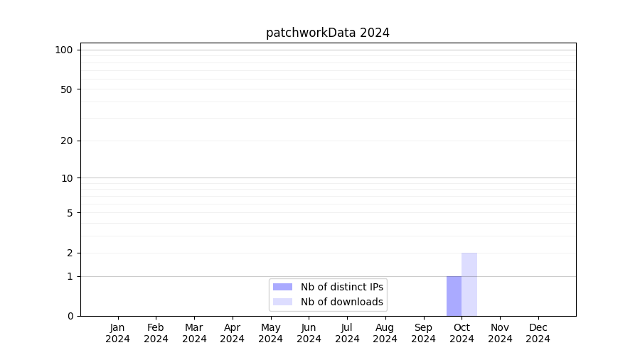 Number of downloads for annotation package patchworkData, year by year, from 2025 back to 2014 (years with no downloads are omitted):