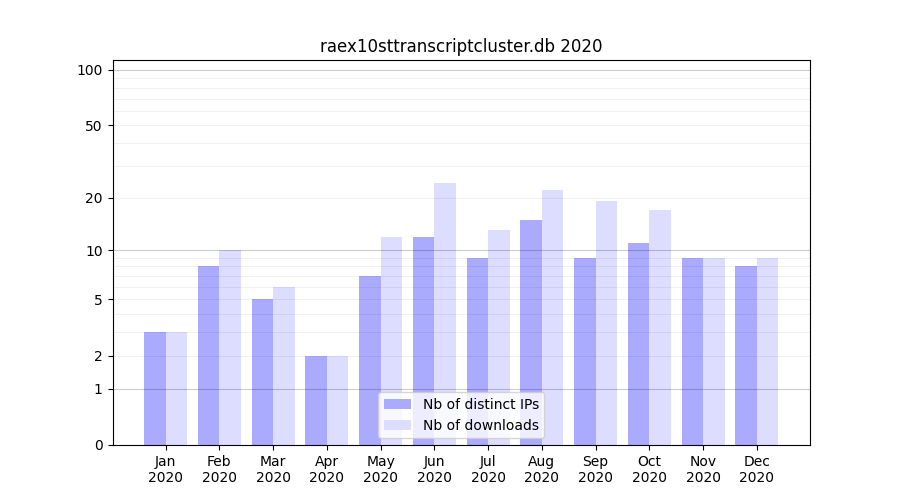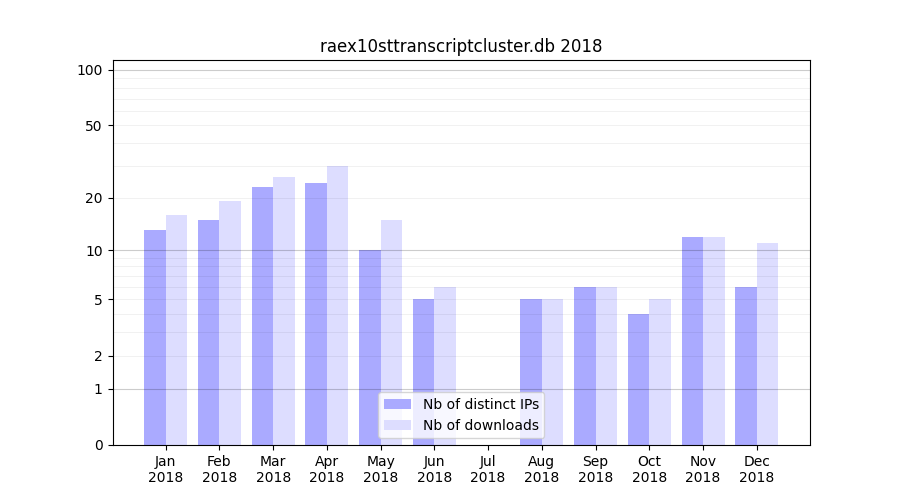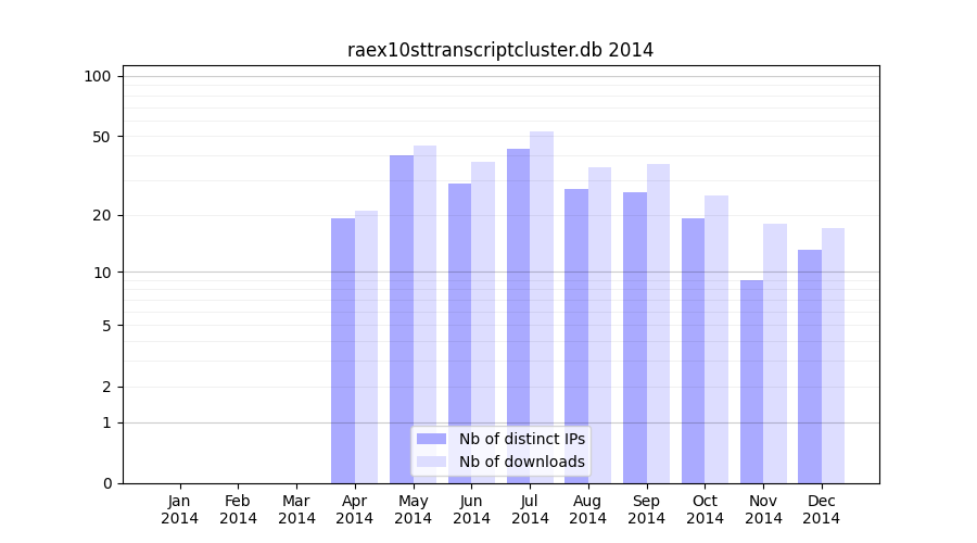 Number of downloads for annotation package raex10sttranscriptcluster.db, year by year, from 2025 back to 2014 (years with no downloads are omitted):