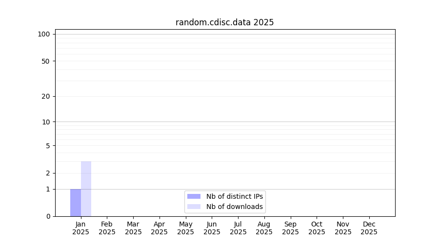 Number of downloads for annotation package random.cdisc.data, year by year, from 2025 back to 2014 (years with no downloads are omitted):