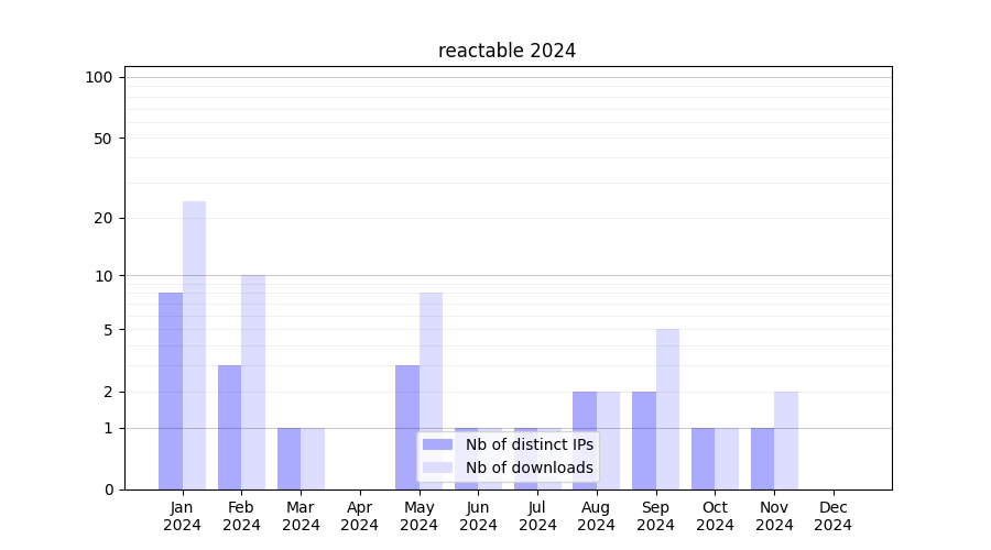 Number of downloads for annotation package reactable, year by year, from 2025 back to 2014 (years with no downloads are omitted):