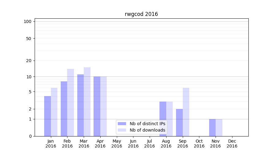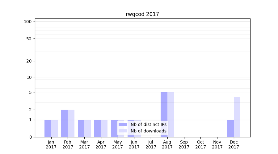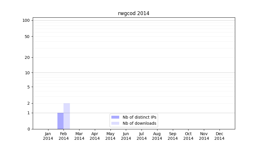 Number of downloads for annotation package rwgcod, year by year, from 2025 back to 2014 (years with no downloads are omitted):