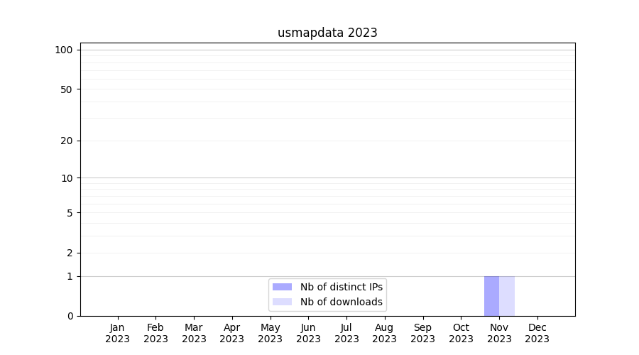 Number of downloads for annotation package usmapdata, year by year, from 2025 back to 2014 (years with no downloads are omitted):